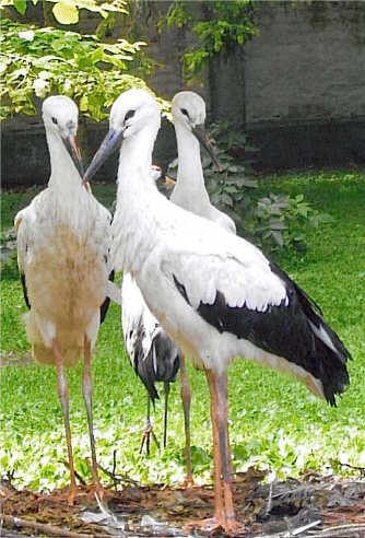 Wie kann man flügge Alt- und Jungstörche sicher unterscheiden?Altstörche haben rote Schnäbel und Beine, Jungstörche einen kurzen schwarze Schnäbel bzw. schwärzlich bis gelblich-graue Beine. Schon in den letzten 2 Wochen vor dem Ausfliegen der Jungen wird der Schnabel länger und an der Spitze gelblich bis rötlich, ebenso die Beine. Noch bis zum Wegzug Ende August sind die Jungen an diesen Kennzeichen sicher zu erkennen. Nach einem Jahr allerdings sehen Altstorch und "Jungstorch" gleich aus. |